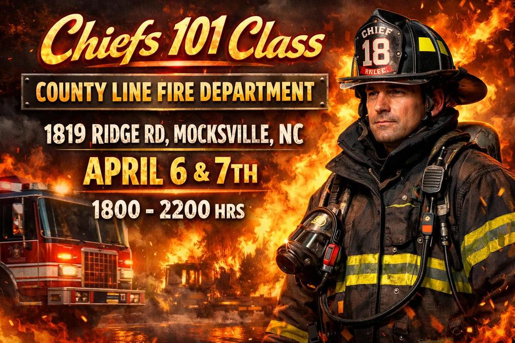 Chief 101 will be hosted at County Line Fire Department at 1819 Ridge Road, Mocksville, NC, 27028 April 6th & 7th from 6pm-10pm 🔥🚒